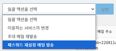 3. 화면 상단의 「일괄 액션을 선택」 목록에서 「패스워드 재설정 메일 발송」을 선택,