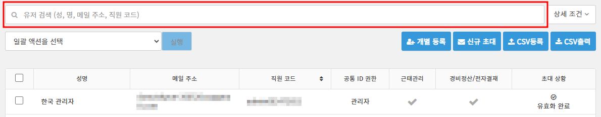 유저 목록의 검색 칸에서는 유저의 이름・메일 주소・직원 코드로 등록된 유저를 검색할 수 있습니다.