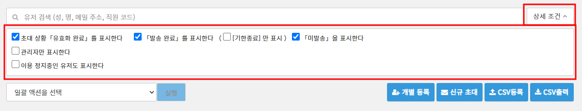| 「발송 완료」를 표시한다 | 초대 상황이 「발송 완료」인 유저를 검색합니다. |
