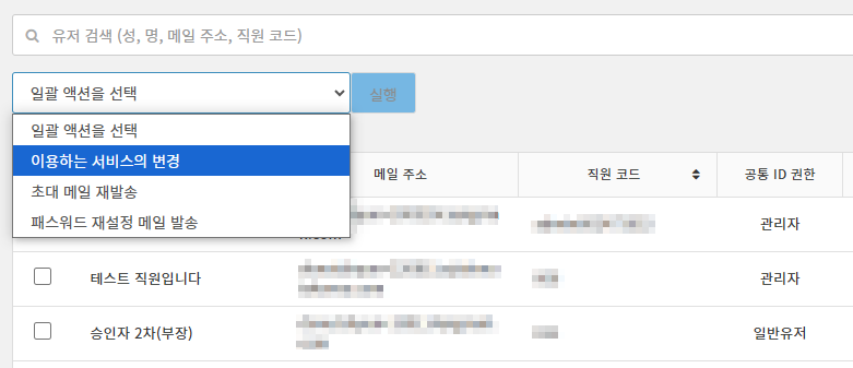 유저 목록에서 작업을 진행할 유저의 체크 박스에 체크를 넣은 후, 「일괄 액션을 선택」의 목록에서