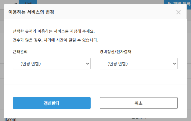 필요한 서비스의 상태를 변경한 후 「갱신한다」 버튼을 클릭하면 선택한 유저들에 대해서 일괄로 이용하는 서비스의 변경이 진행됩니다.