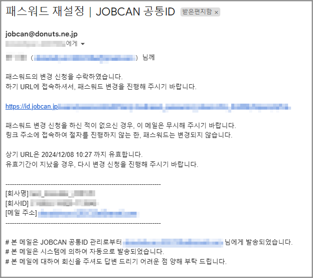 발송되는 메일 「패스워드 재설정|JOBCAN 공통ID」