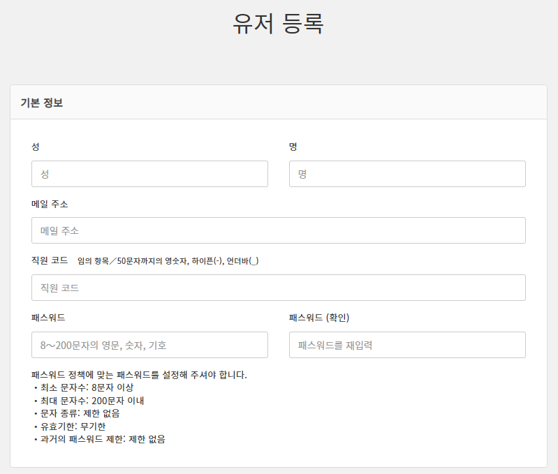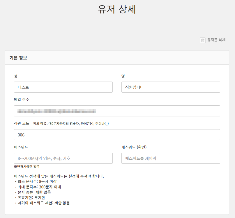 패스워드가 설정된 상태입니다. 관리자가 직접 유저 정보를 입력하여 유저를 등록 한 경우에는 |