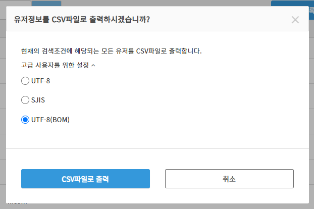 「CSV출력」 을 선택하면 위와 같은 화면이 표시됩니다.