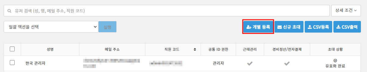 「신규 유저 초대」 는 아직 유저 등록을 하지 않은 직원에게 공통 ID 초대 메일을 발송하는 기능입니다.
