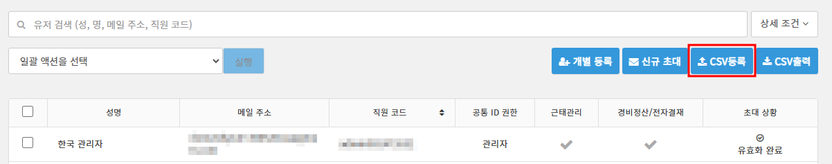 「CSV등록」 에서는 CSV파일을 이용하여 유저를 일괄 등록하는 것이 가능합니다.