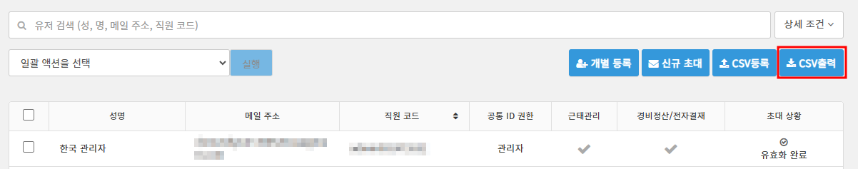 「CSV출력」 에서는 등록 완료한 유저 정보를 CSV 형식으로 다운로드 할 수 있습니다.