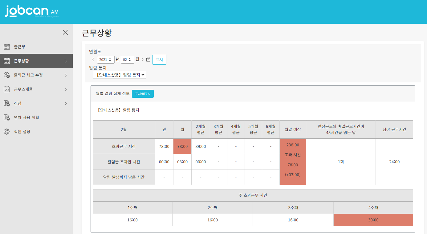근무상황 에서는 취업규칙 알림 설정 에서 설정한 내용에 따라 근무 데이터를 집계하여, 근무시간에 관한 데이터를 표시합니다.
