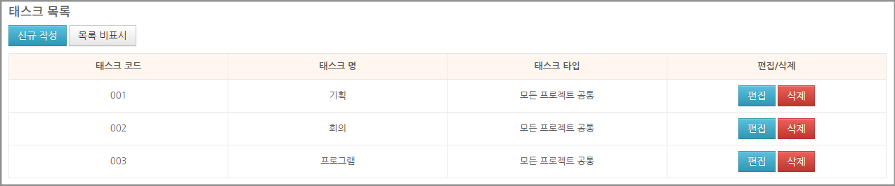 그렇기에 공수 관리 기능을 이용하기 위해서는 우선 프로젝트와 태스크를 등록해야 합니다.