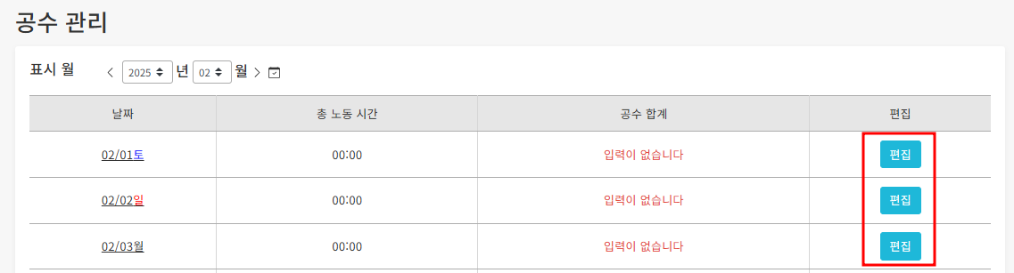 각 날짜의 【편집】 버튼을 누르면 공수 입력 화면으로 이동합니다.