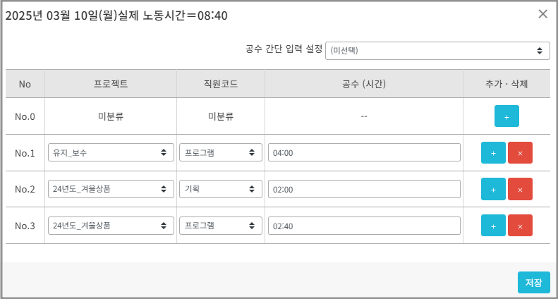 공수를 입력한 후, 【저장】 버튼을 클릭하면 입력한 내용이 저장됩니다.