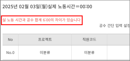 1일의 근무시간과 프로젝트・태스크 별 공수 (시간)에 차이가 있는 경우, 입력 화면에 차이가 발생한 시간이 빨간 글자로 표시됩니다.