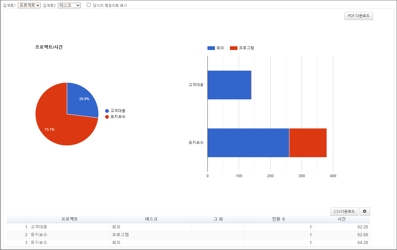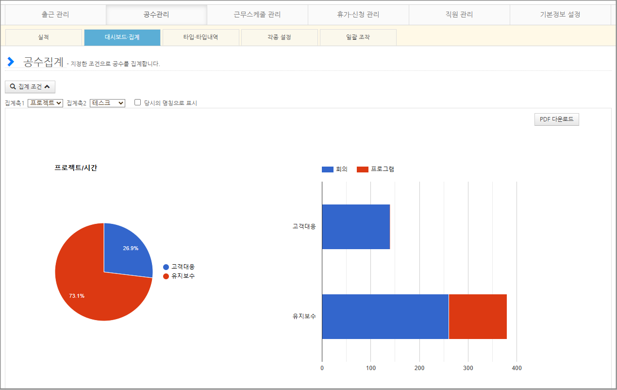 직원이 입력한 공수를 집계하여 그래프로 데이터를 확인할 수 있습니다.