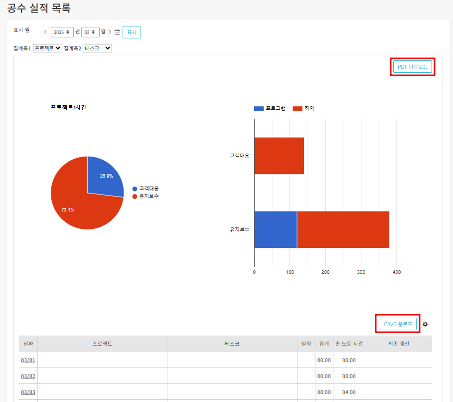 공수 관리 → 공수 실적 목록 → 「표시」 → 「PDF 다운로드」 또는 「CSV 다운로드」