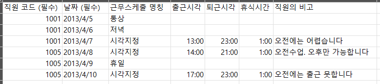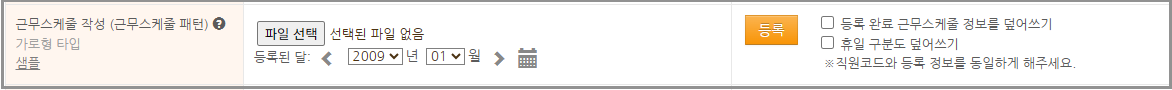 기본정보 설정 → 일괄 등록 → 근무스케줄 정보 (근무스케줄 정보 일괄등록)