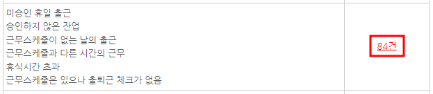 | 미승인 휴일 출근 | 승인하지 않은 날에 휴일 출근이 있는 경우 |