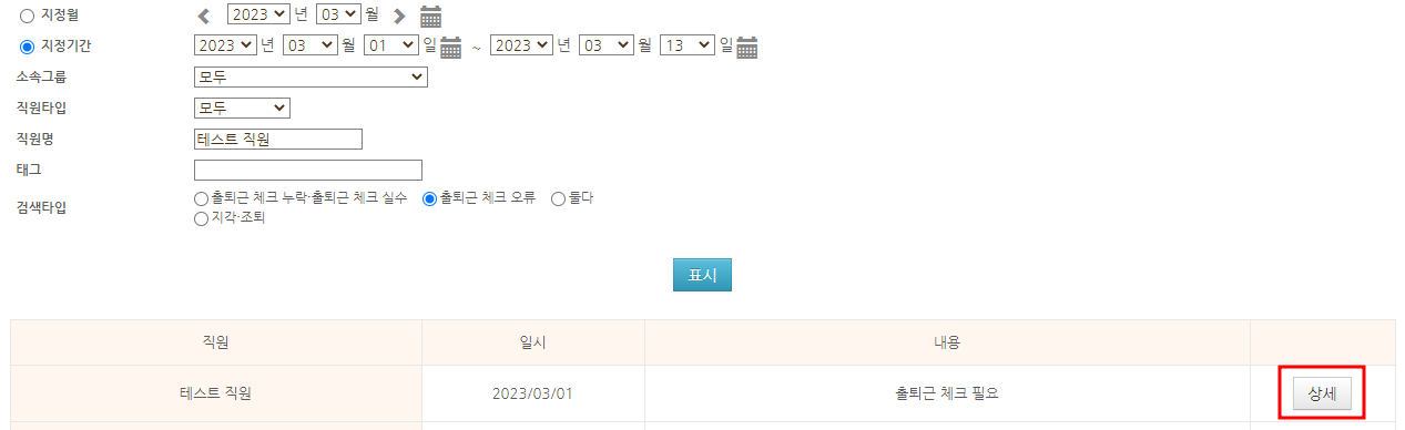 직원분에게 출퇴근 체크 수정신청에 대한 안내를 해주시기 바랍니다.