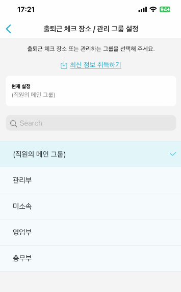 입력한 텍스트가 출퇴근 체크 장소 명칭 또는 그룹 코드에 포함되어 있고, 설정 가능한 출퇴근 체크 장소가 목록에 표시됩니다.