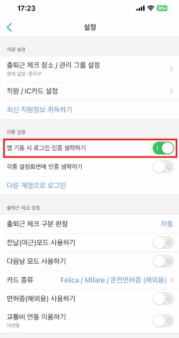 설정화면의 인증 설정에서 「앱 기동시 로그인 인증 생략하기」를 ON으로 설정합니다.