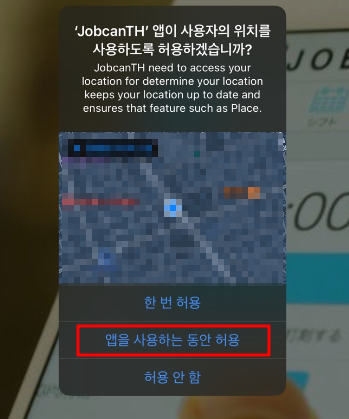 GPS 출퇴근체크 기능을 이용하시는 경우, [앱을 사용하는 동안 허용] 을 선택해주시기 바랍니다.