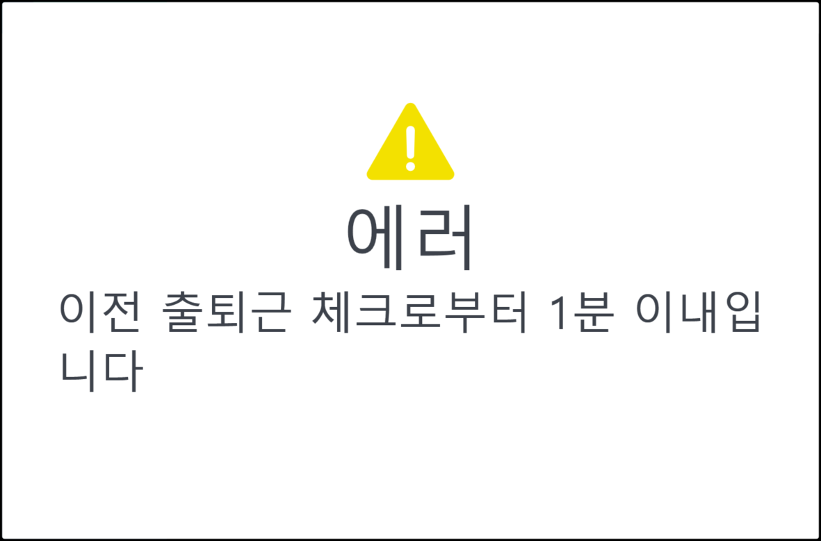 1분 내에 출퇴근체크를 찍은 상태에서 또 다시 출퇴근체크를 하면 아래와 같이 에러가 표시됩니다.
