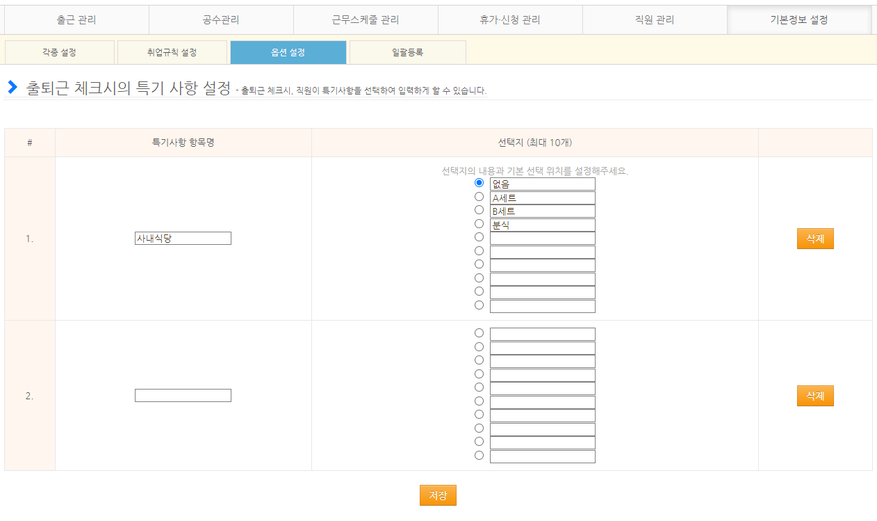 고객센터를 통해 계정 설정이 완료되면 관리자 페이지의 [기본정보 설정] > [옵션 설정] > [출근 관리] 의 [출퇴근 체크 시의 특기 사항 설정] 항목을 통해서 특기사항 설정을 진행할 수 있습니다.