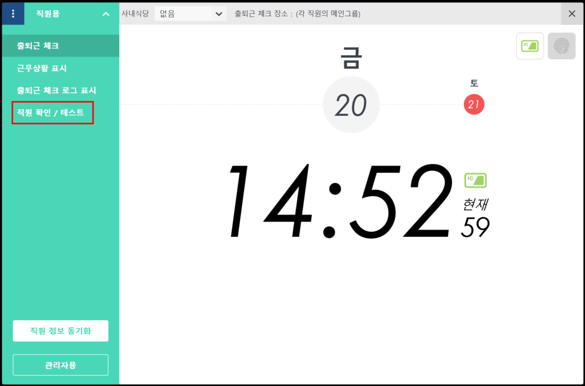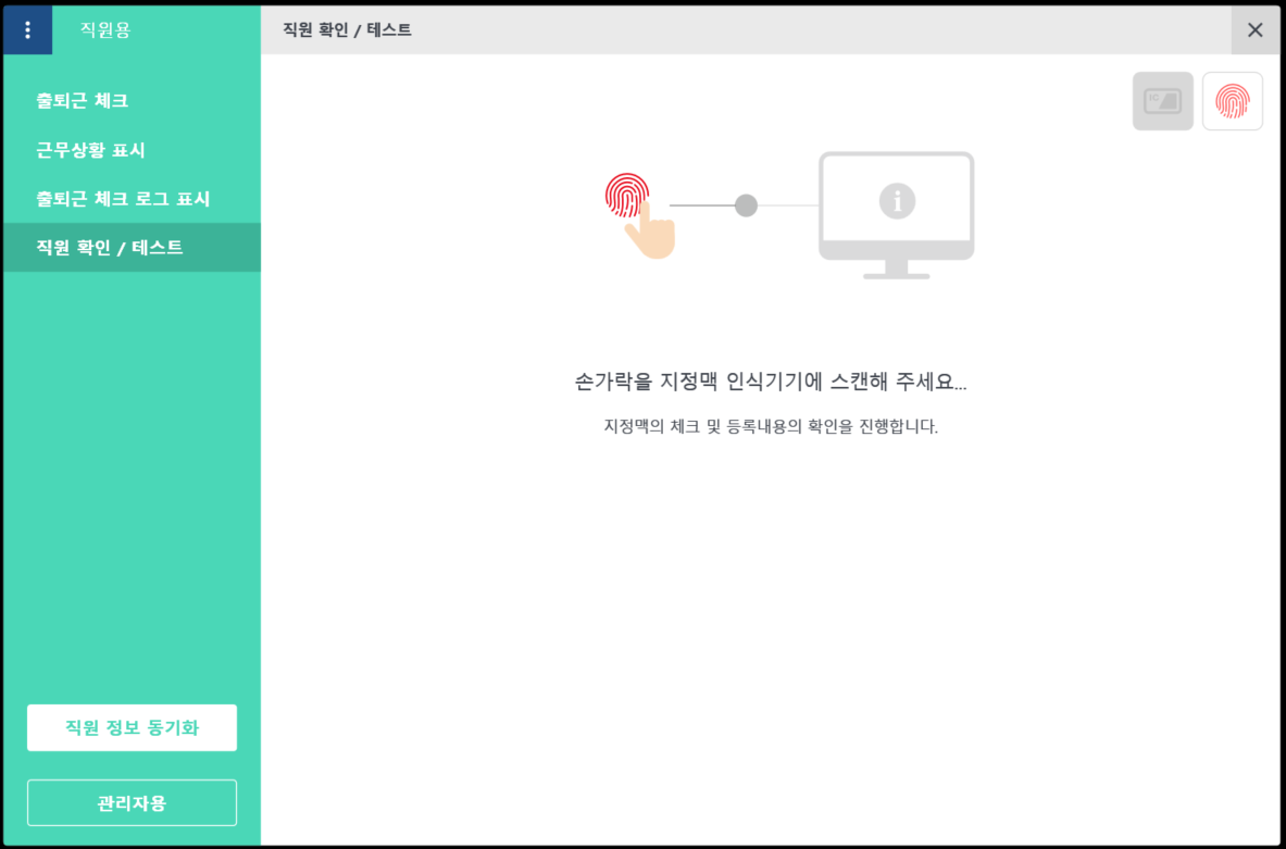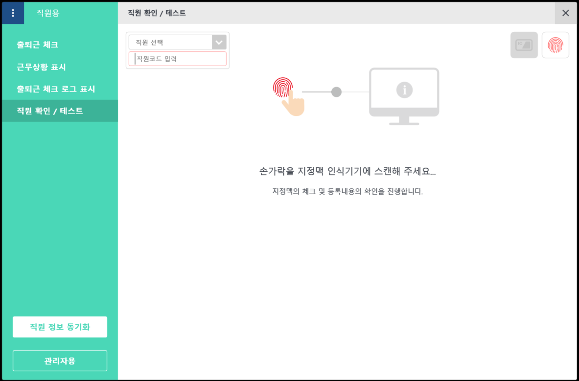 죄측 상단에 직원 선택란이 표시되므로, 테스트를 진행할 직원을 선택한 후에 손가락을 인식시켜 주세요.