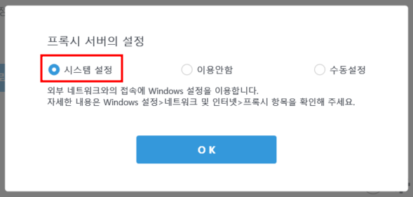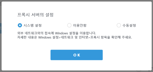 보통은 설정이 필요없는 내용이므로, 프록시 설정이 필요한 지에 대해서는 사내 네트워크 관리자에게 확인해 주시기 바랍니다.