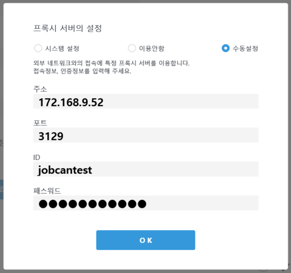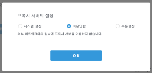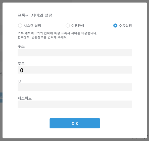 2.프록시 서버 설정을 선택, 입력한 후 「OK」 버튼을 누르면 설정이 저장됩니다.