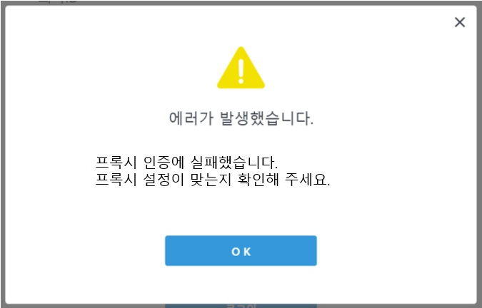 원인:이용하는 프록시 서버의 인증정보(ID/패스워드)에 오류가 있어서
