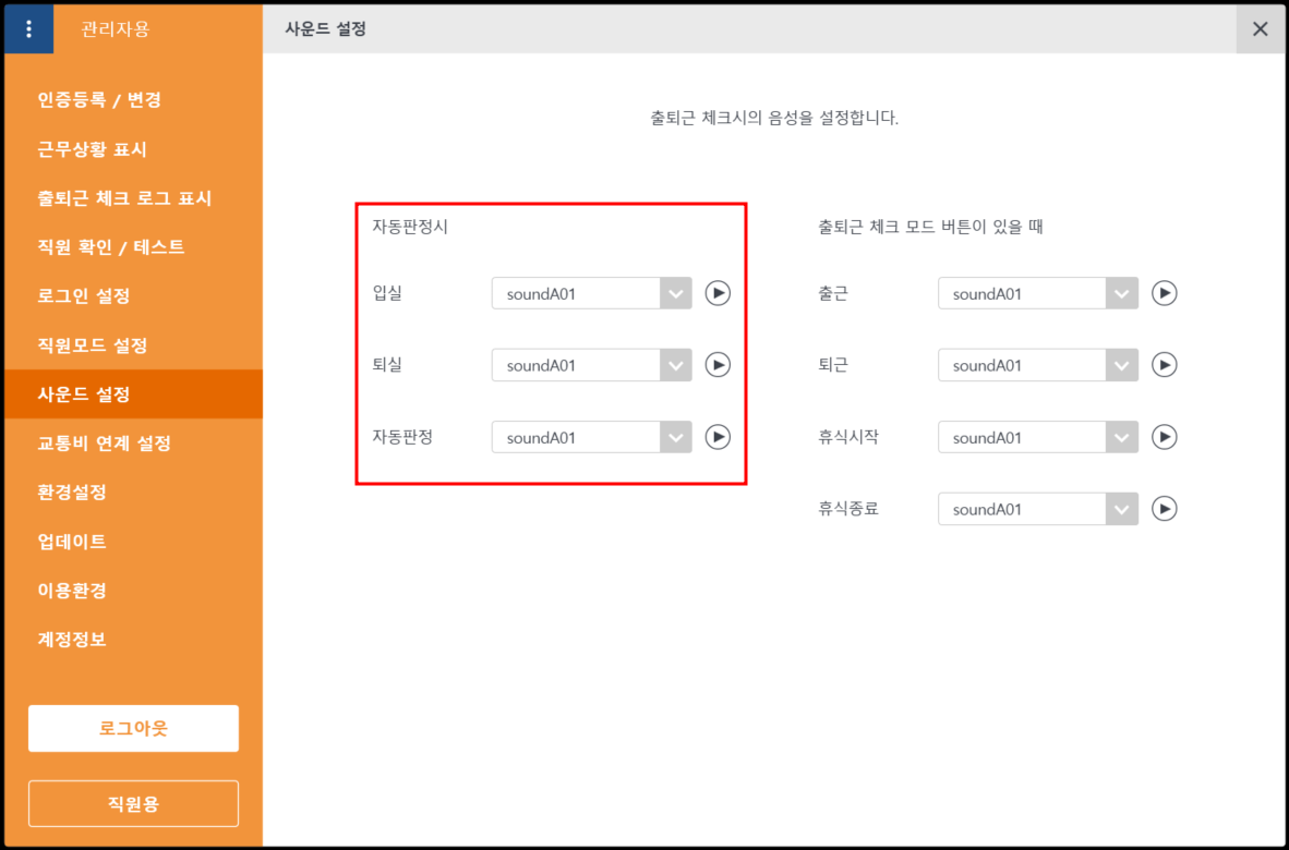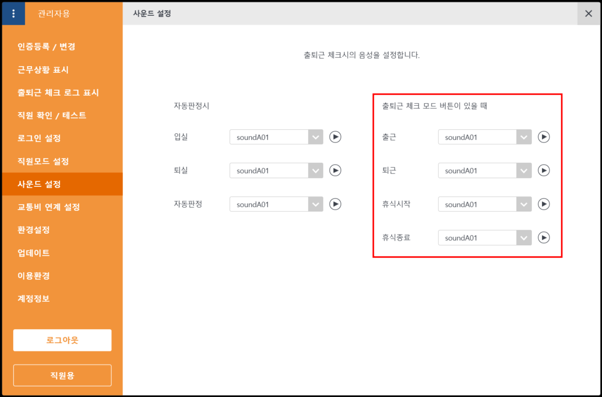 출퇴근체크 시, 어떤 내용을 선택했는지에 따라서 나오는 사운드를 여기서 설정할 수 있습니다.