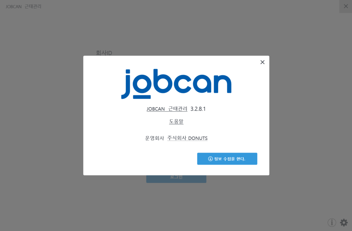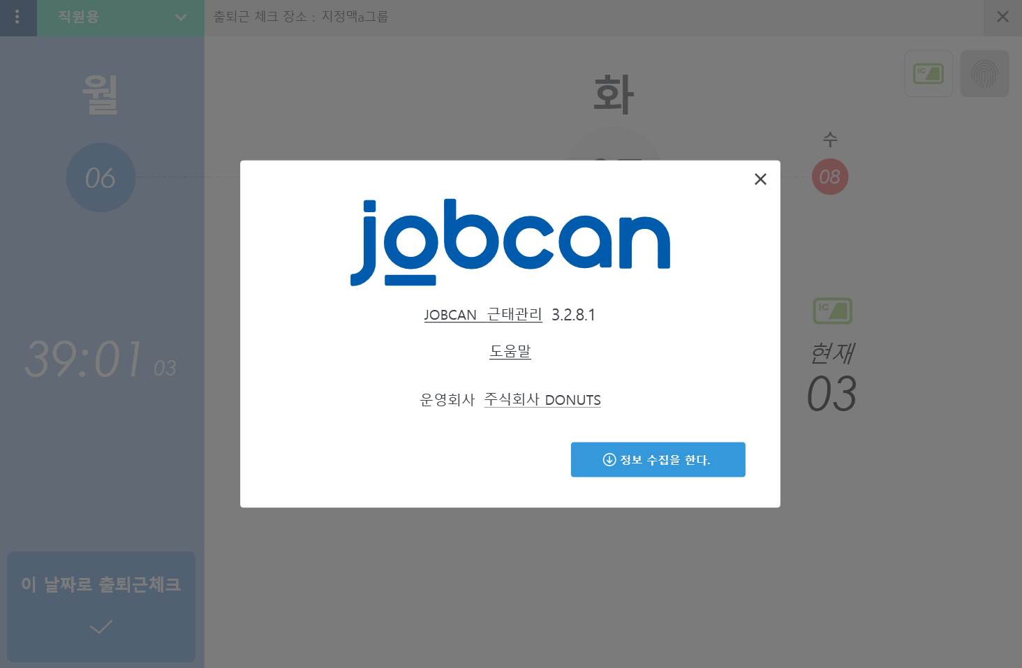 화면 중앙의 「JOBCAN 근태관리」 옆에 적힌 숫자(예: 3.2.8.1)가 지금 실행 중인 프로그램의 버전입니다.