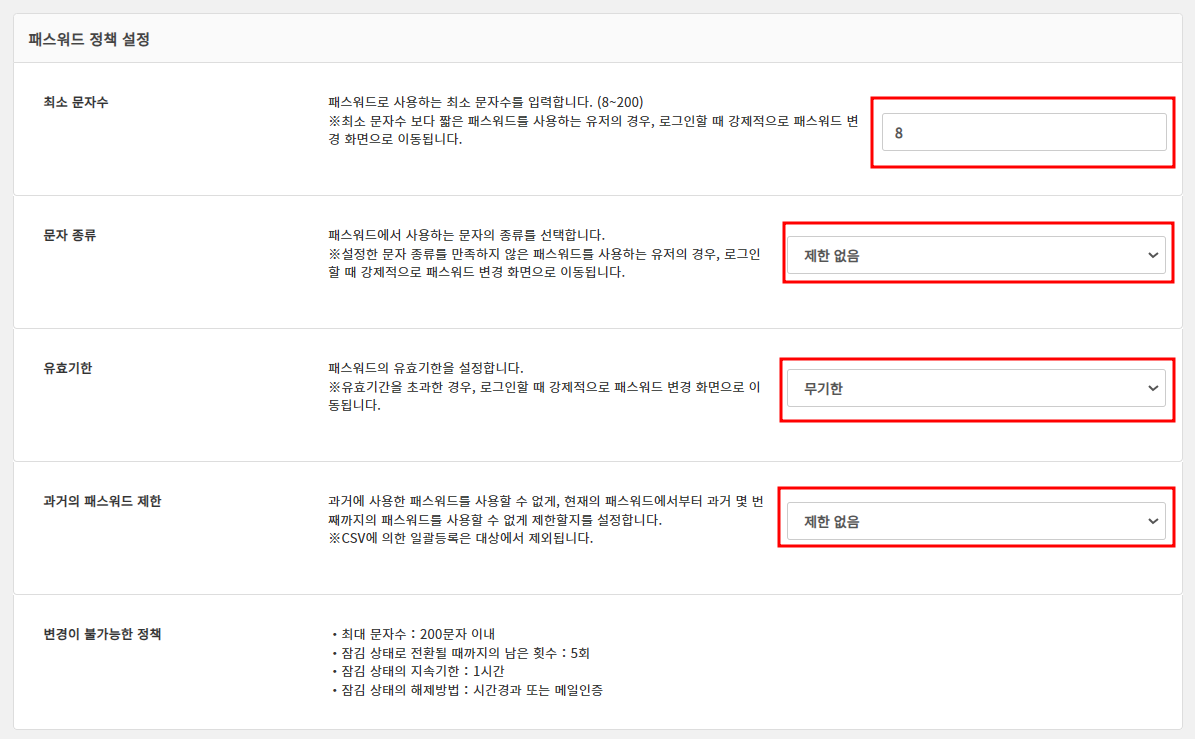 3.그 외 설정 화면의 [패스워드 정책] 에서 필요한 설정을 진행한 후, 하단의 「저장한다」를 클릭